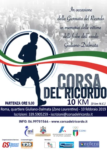 Domenica 10 febbraio 2019, come ormai tradizione da sei anni, si correrà la VI edizione della Corsa del Ricordo, la manifestazione podistica ideata ed organizzata da Asi per commemorare ‘sportivamente’ gli italiani caduti nelle Foibe e per ricordare l’esodo delle popolazioni italiane che risiedevano in Istria e Dalmazia, scacciati dalle proprie case dalle truppe del Maresciallo Tito alla fine della seconda Guerra Mondiale. La gara quest’anno si svolgerà proprio nella data che il Governo Italiano ha istituito nel 2004, per la “Giornata del Ricordo” dopo oltre sessant’anni di colpevole oblio e silenzio sui tragici eventi, e sarà inserita nel programma delle numerose manifestazioni organizzate nell’occasione in tutta Italia.